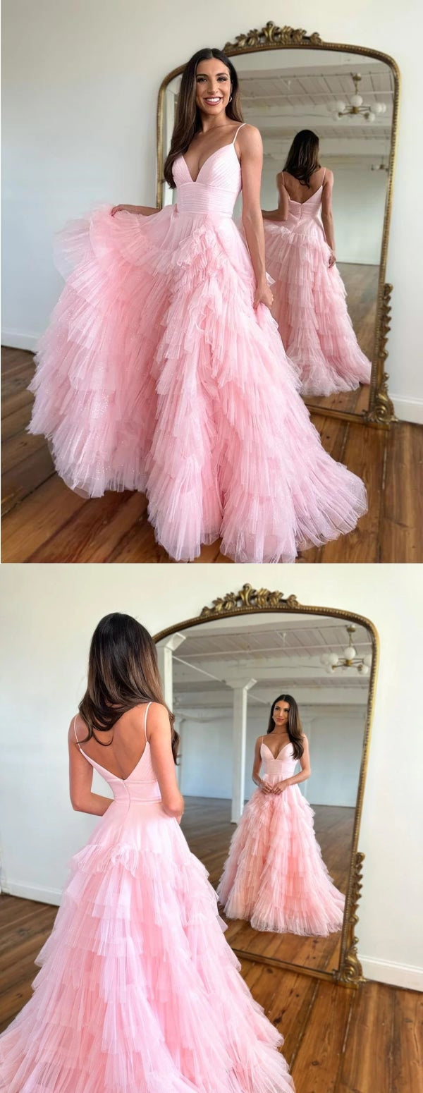 Cute Pink A-line V-neck Spaghetti Straps Maxi Long Party Prom Dresses,13083