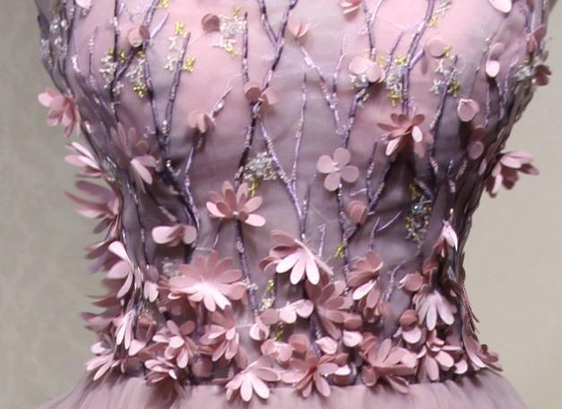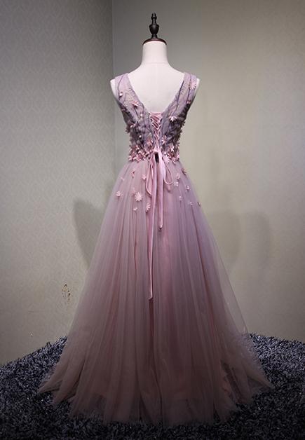 Pink See Through V Neck A-line Tulle Long Evening Prom Dresses, 17616