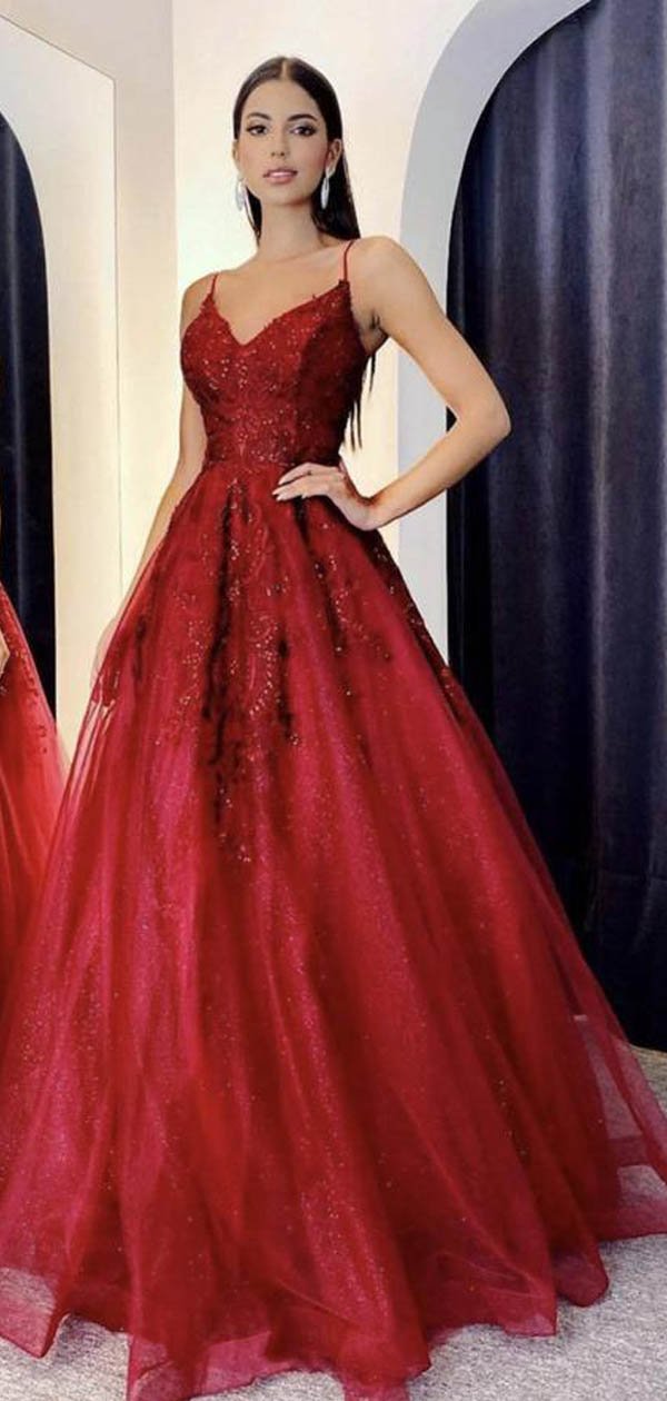 Red A-line Spaghetti Straps V-neck Cheap Long Prom Dresses Online,12529