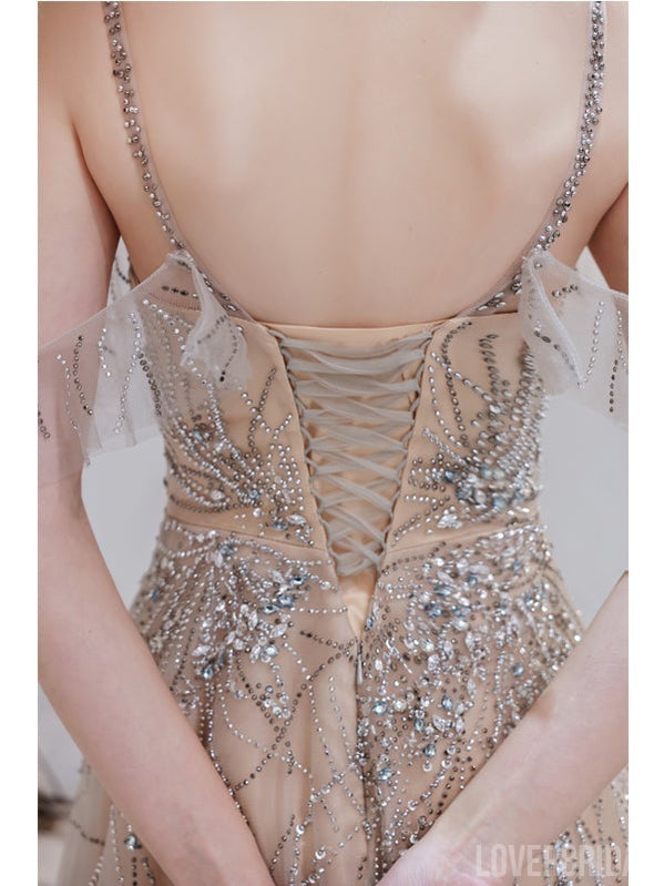 Spaghetti Straps A-line Off Shoulder V-neck Long Prom Dresses Online,12571