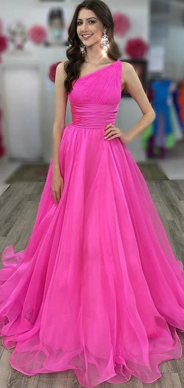 Pink A-line One Shoulder Cheap Long Prom Dresses, Evening Party Dresse