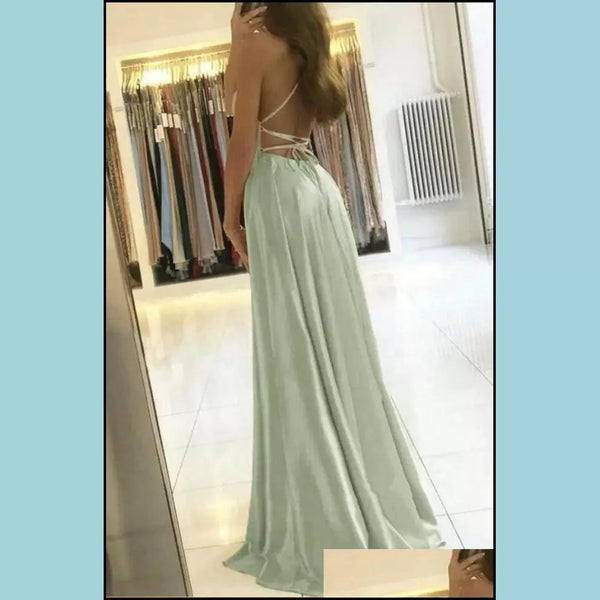Sage A-line Spaghetti Straps High Slit Cheap Long Prom Dresses Online,12709