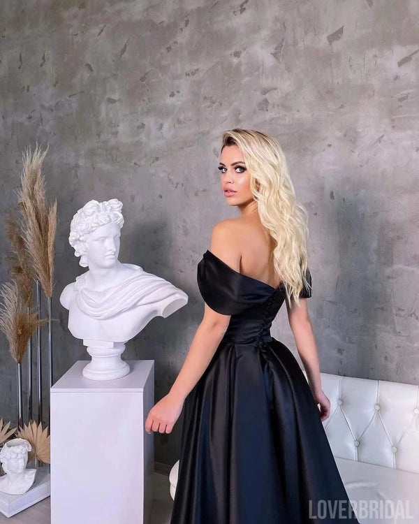 Simple Black A-line Off Shoulder Side Slit Long Prom Dresses Online,12596
