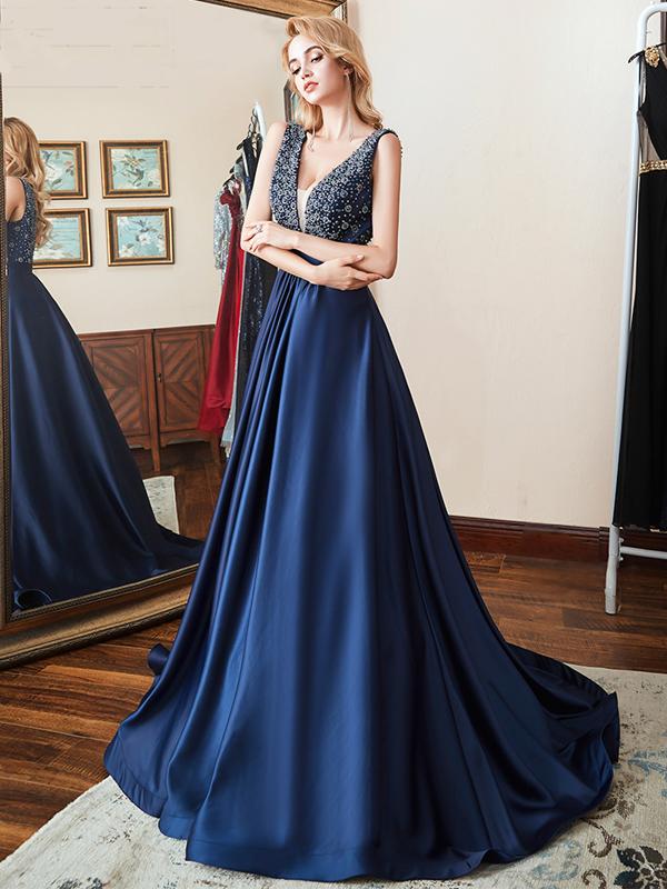 Sexy Blue A-line Straps V-neck Backless Cheap Long Party Prom Dresses Online,12364