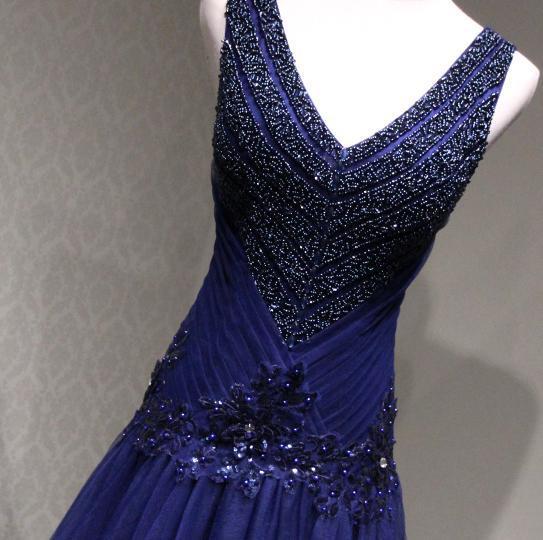 Sexy V Neck Navy Blue Beaded A-line Long Evening Prom Dresses, 17622