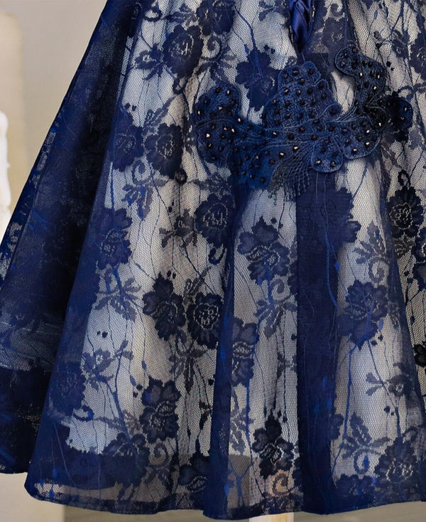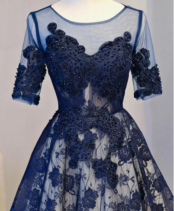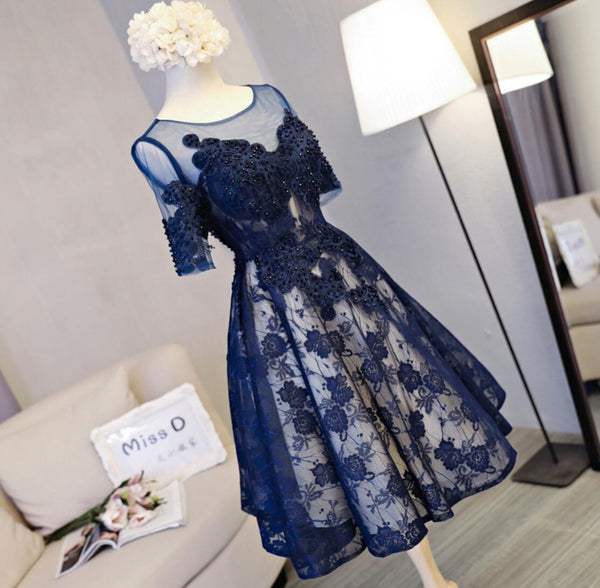 Short Sleeve Navy Lace Open Back Homecoming Prom Dresses, Affordable Short Party Prom Dresses, Perfect Homecoming Dresses, CM298
