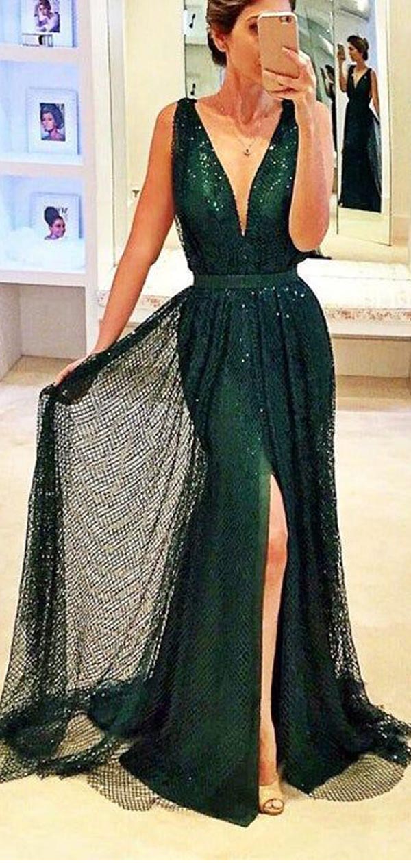 Sexy Green Mermaid High Slit V-neck Maxi Long Party Prom Dresses,13094