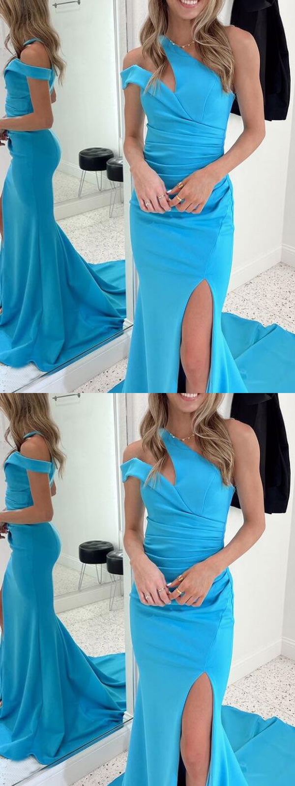 Elegant Blue Mermaid One Shoulder Side Slit Maxi Long Party Prom Dresses, Evening Dress,13173