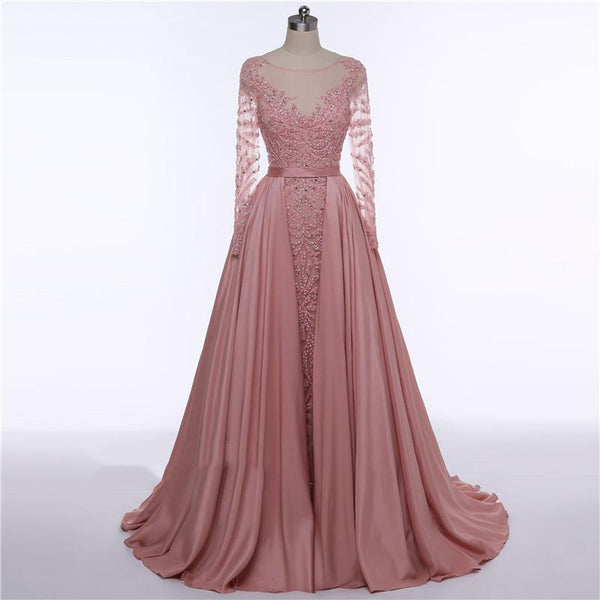 Long Sleeve See Through Heavily Beaded Dusty Pink Long Evening Prom Dr