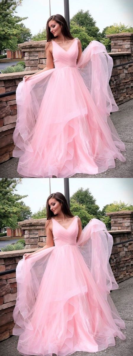 Popular Pink A-line V-neck Maxi Long Party Prom Dresses, Evening Dress,13239