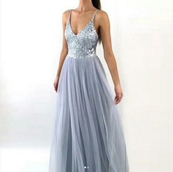 Sexy Backless Gray Sequin Tulle Long Evening Prom Dresses, Popular Cheap Long Party Prom Dresses, 17290