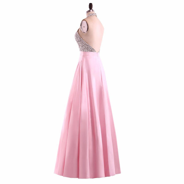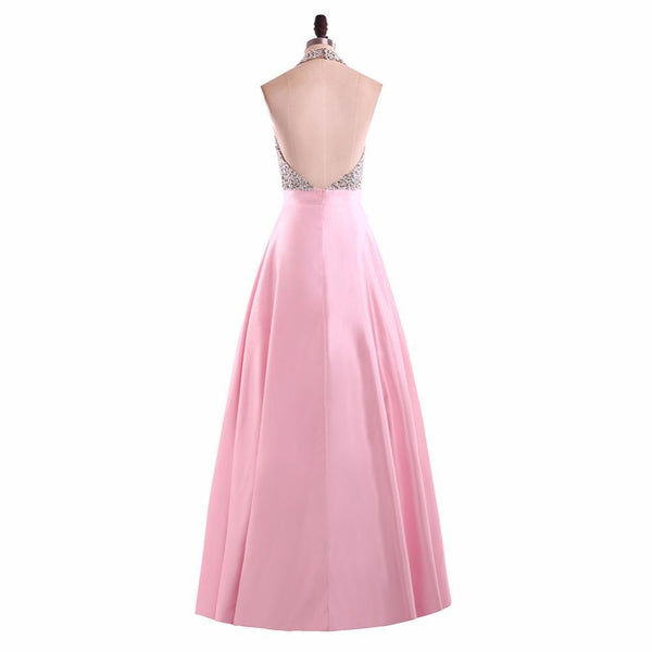 Sexy Backless Halter Heavily Beaded Pink Long Evening Prom Dresses, Popular Cheap Long Party Prom Dresses, 17236