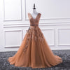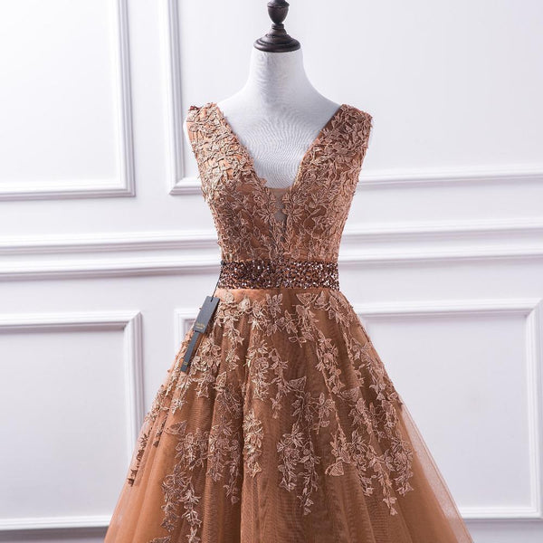 Sexy Deep V Neckline Brown A line Lace Long Evening Prom Dresses, Popular Cheap Long Party Prom Dresses, 17237