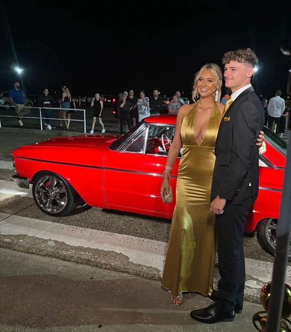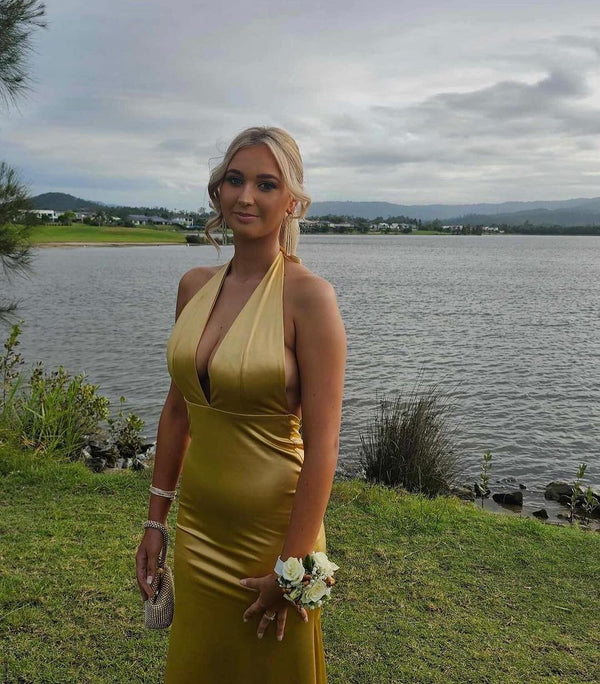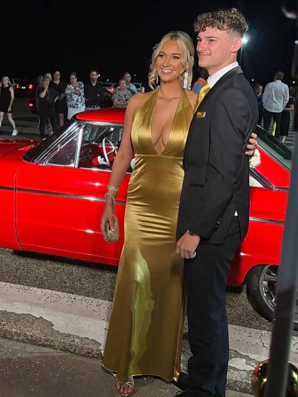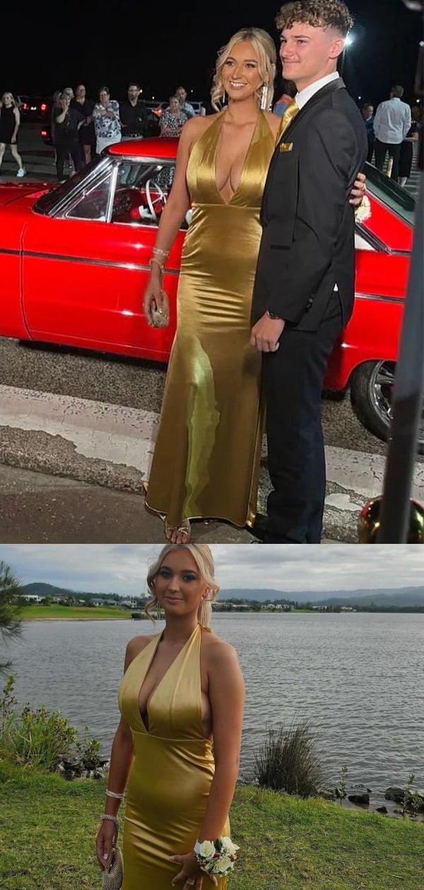 Sexy Gold Mermaid Halter V-neck Maxi Long Party Prom Dresses,Evening Dress,13316