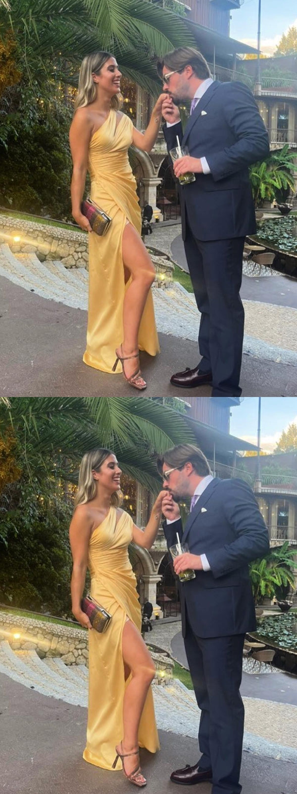 Sexy Yellow Mermaid One Shoulder Side Slit Maxi Long Party Prom Dresses, Evening Dress,13185